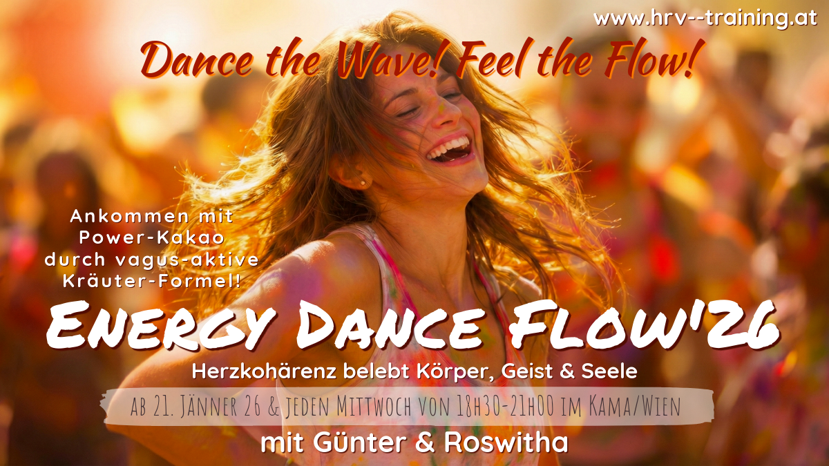 Stell Dir vor es gibt eine Art freies Tanzen in Dir zu entdecken, eine langsame rhythmisch pulsierende Abfolge von Bewegungen. Dein Atem wird dabei frei und Du bewegst Dich leicht und fließend mit Gleichgesinnten im herzkohärenten Raumerleben... Herzlich willkommen beim Energy Dance Flow, dem Freien Tanzen in Wien!
