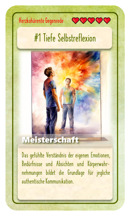 "Wie meinst du das?" Markus runzelt die Stirn, aber seine Augen verraten eine Spur von Neugier. "Kommunikationskarten", erklärt sie, während ihre Finger über die glatte Oberfläche der Karten streichen, "für Herzkohärenz." Er schmunzelt skeptisch. "Und wie funktioniert das?" "Wir ziehen eine Karte, wenn wir spüren, dass es passt. Sie enthält eine Frage oder einen Tipp, um uns zu helfen, tiefer zu gehen, ohne das Gespräch zu unterbrechen." Markus nickt, halb neugierig, halb amüsiert. "Also, welche ziehst du?" |